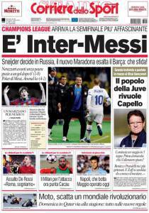 Anche il Corriere dello Sport parla del super match che attende l’Inter nella semifinale di Champions League contro il Barcellona di un Messi stratosferico. Enfaticamente si parla addirittura di una sfida Inter-Messi. Il titolo è volutamente esagerato, ma serve a sottolineare quanto sia decisivo il fuoriclasse argentino, celebrato oggi da tutta la stampa sportiva del mondo!