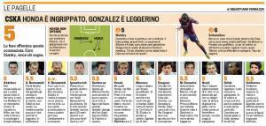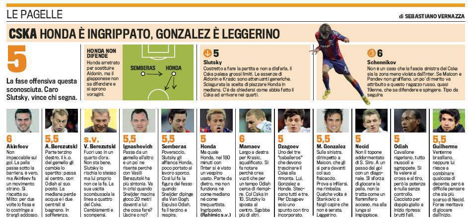 MOSCA (Russia) – Pessima prestazione del Cska Mosca che dopo aver battuto agli ottavi il Siviglia aveva spaventato l’Europa del pallone. Invece la formazione di Slutsky delude nel doppio confronto contro l’Inter. Ieri sufficienza per il portiere Akinfeev, Mamaev e Shennikov, il resto della squadra è insufficiente, anche e soprattutto Honda.
