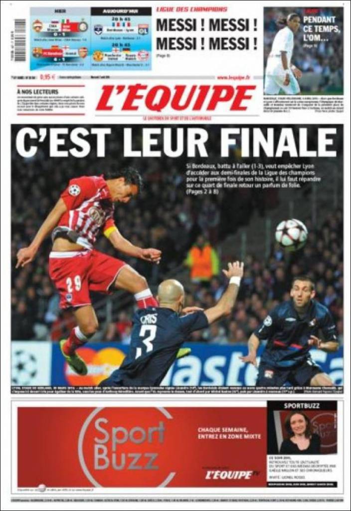 Il massimo quotidiano francese L’Equipe parla del ritorno dei quarti di finale tra Bordeaux e Lione che all’andata vide la vittoria della squadra di Puel per tre ad uno. Per i francesi è motivo di grande prestigio avere due squadre a giocarsi la semifinale di Champions, e l’obiettivo sarebbe riportare una squadra in finale dopo il grande exploit del Monaco targato Didier Deschamps. Alle 22e30 circa, salvo supplementari, si saprà chi tra Lione e Bordeaux si sarà guadagnato la semifinale!