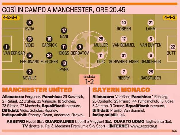 MANCHESTER (Inghilterra) – Questa sera il Manchester United di Sir Alex Ferguson cercherà l’accesso alle semifinali di Champions League cercando di recuperare il due a uno dell’andata. Mancherà l’infortunato Rooney che verrà sostituito da Berbatov, mentre nei tedeschi panchina per Gomez con Muller confermato in attacco con Olic. Le formazioni della Gazzetta dello Sport.