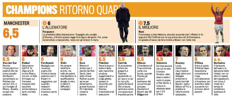 MANCHESTER (Inghilterra) – Una partita maledetta per Sir Alex Ferguson ed il suo Manchester che escono dalla Champions League per mano del Bayern Monaco nonostante la vittoria per tre a due in casa. Il migliore degli inglesi è il portoghese Nani, autore di una doppietta straordinaria, ma anche Rooney è stato come sempre autore di una grande partita, nonostante il recupero lampo dall’infortunio dell’andata. A centrocampo bene Gibson autore del primo gol mentre non convince la prova di Carrick. Le pagelle della Gazzetta dello Sport.