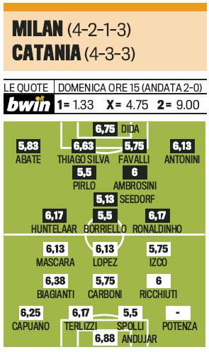 MILANO – Domenica pomeriggio il Milan ospiterà il Catania di Mihajlovic con l’obiettivo categorico dei tre punti. Nei rossoneri probabile l’impiego del tridente d’attacco “pesante” ovvero Ronaldinho-Huntelaar-Borriello, lo stesso che ha battuto il Cagliari una settimana fa. In difesa confermata la coppia centrale Thiago Silva-Favalli che dovranno tenere a bada lo scatenato Maxi Lopez, mentre a centrocampo coppia fissa Pirlo-Ambrosini. Ecco le probabili formazioni della Gazzetta dello Sport.