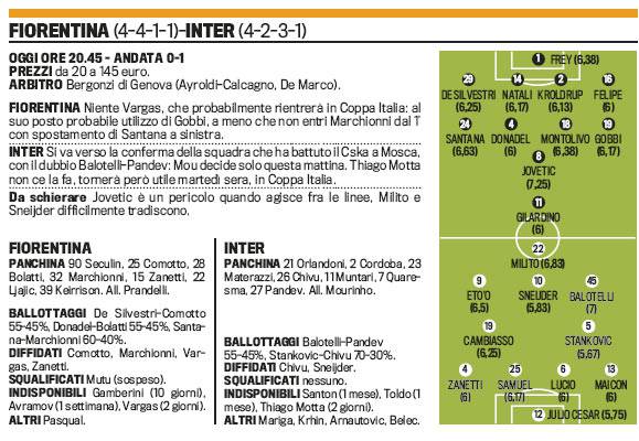 FIRENZE – Ecco i 22 che, con ogni probabilità, daranno vita all’anticipo serale di oggi: Fiorentina-Inter, vero match clou della 33a di Serie A, uno degli ultimi ostacoli per Mourinho e i suoi sulla via dello scudetto. Seconda la ‘Gazzetta’ il tecnico portoghese punterà nuovamente sul modulo-Champions, mentre Prandelli si affiderà al suo bomber per cercare di restare aggrappato al sogno 4° posto…