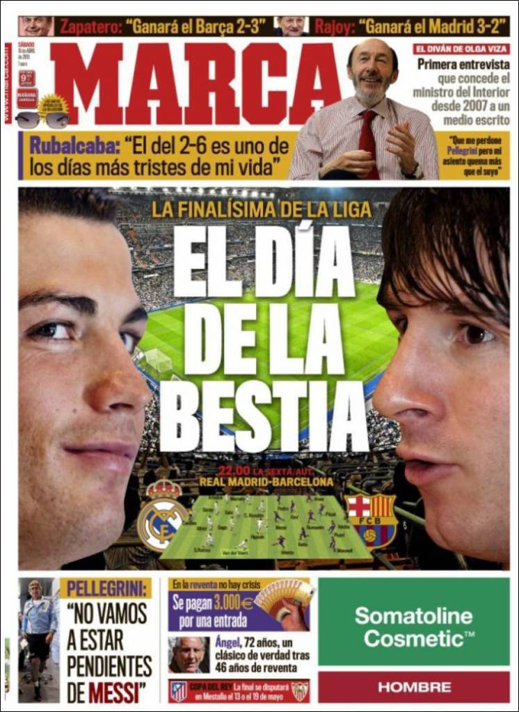 Oggi il quotidiano spagnolo Marca parla della grande sfida di questa sera tra Real Madrid e Barcellona, ovvero lo scontro tra Cristiano Ronaldo e Lionel Messi, forse i due giocatori più forti al mondo in questo momento.