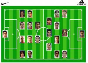 ROMA – Curiosa immagine realizzata dal Mundo Deportivo, che vede il Real Madrid ed il Barcellona con gli undici titolari mischiati nelle rispettive formazioni, in un duello di sponsor tra Nike ed Adidas. La febbre per il clasico è sempre più alta, non solo in Spagna: stasera al Bernabeu ci sarà praticamente tutto il pianeta. Quale occasione migliore proprio per gli sponsor?