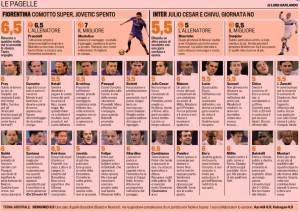 FIRENZE – Pareggio che fa tremare l’Inter, infatti la Fiorentina ha fermato sul 2 a 2 i nerazzurri e oggi la Roma con una vittoria può scavalcare la squadra di Mourinho, degli 11 mandati in campo dal portoghese si salva solo Wesley Sneijder. L’olandese è stato infatti il migliore in campo della compagine nerazzurra. Di seguito le pagelle prese da La Gazzetta dello Sport.
