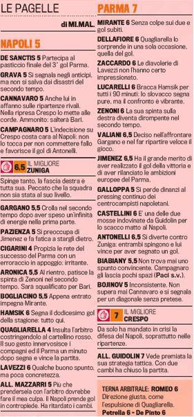 NAPOLI – Colpaccio del Parma che sbanca il San Paolo vincendo 3 a 2 in casa del Napoli con molte polemiche da parte dei partenopei che hanno accusato l’arbitro di aver condizionato il risultato finale. Ora la squadra di Walter Mazzarri ha l’Europa più lontana e molto probabilmente si dovrà accontentare di un posto in Europa League. Ecco le pagelle della partita prese dalla Gazzetta dello Sport.