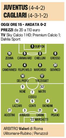 TORINO – La Juventus si appresta ad affrontare il Cagliari. Nella formazione titolare dovrebbe rivedersi Buffon, con, in attacco, la vecchia coppia Trezeguet-Del Piero. Ai bianconeri serve come oro una vittoria per rimanere ancorati al treno Champions League guidato abilmente dalle sorprendenti formazioni Palermo e Sampdoria. C’è attesa per sapere come reagiranno i tifosi della Juventus.