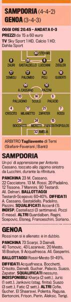 GENOVA – In attesa per il derby della Lanterna di stasera tra Sampdoria e Genoa in cui si gioca anche un posto in Europa, la Gazzetta dello Sport ha ipotizzato le probabili formazioni di entrambe le squadre che non stanno attraversando un bel periodo. Ecco i probabili schieramenti delle due formazioni liguri.