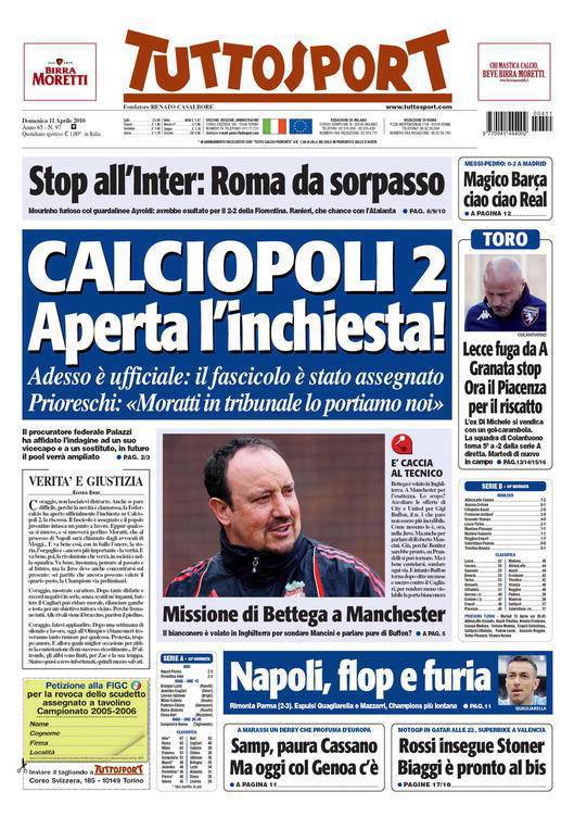 TORINO – Il quotidiano torinese Tuttosport annuncia l’apertura dell’inhiesta di Calciopoli 2, con il fascicolo che verrà affidato a Prioreschi. Le intercettazioni venute a galla in questi giorni alquanto “turbolenti” hanno quindi convinto gli inquirenti ad aprire un nuovo fascicolo per accertare eventuali altri illeciti sportivi dopo quelli già confermati durante l’estate del 2006.