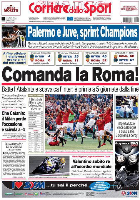Anche il Corriere dello Sport celebra la Roma capolista che con la gestione Ranieri ha fatto un filotto di vittorie consecutive e di risultati utili. Ora i giallorossi sono padroni del campionato a cinque giornate dal termine e la prossima giornata prevede Inter-Juventus ed il derby capitolino, due sfide che potrebbero decidere le sorti del campionato.