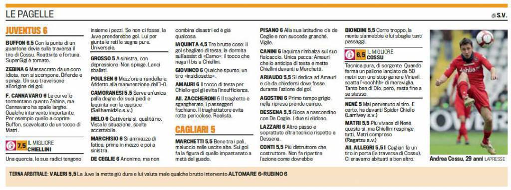 TORINO – Nel match di ieri pomeriggio tra la Juventus ed il Cagliari, vinto dai bianconeri per uno a zero con gol di Chiellini, grandi protagonisti sono stati sia il difensore bianconero sia il centrocampista dei sardi Cossu. Una vittoria importante per la Juventus in chiave Champions League, anche se il Palermo e la Sampdoria non mollano la presa. Le pagelle della Gazzetta dello Sport.