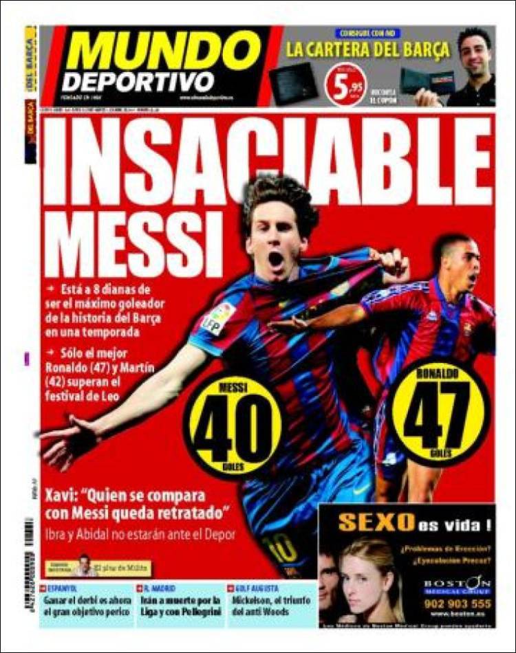 Sul quotidiano catalano El Mundo Deportivo si parla del talento del Barcellona e del calcio mondiale Lionel Messi definito “insaziabile”. Infatti l’argentino ha dichiarato di voler vincere tutti i trofei possibili sia con il Barcellona, sia con l’Argentina e sia a livello personale, con il probabile secondo Pallone d’Oro e la Scarpa d’oro visto che con il gol nel “Clasico” ha superato in classifica Rooney del Manchester United.