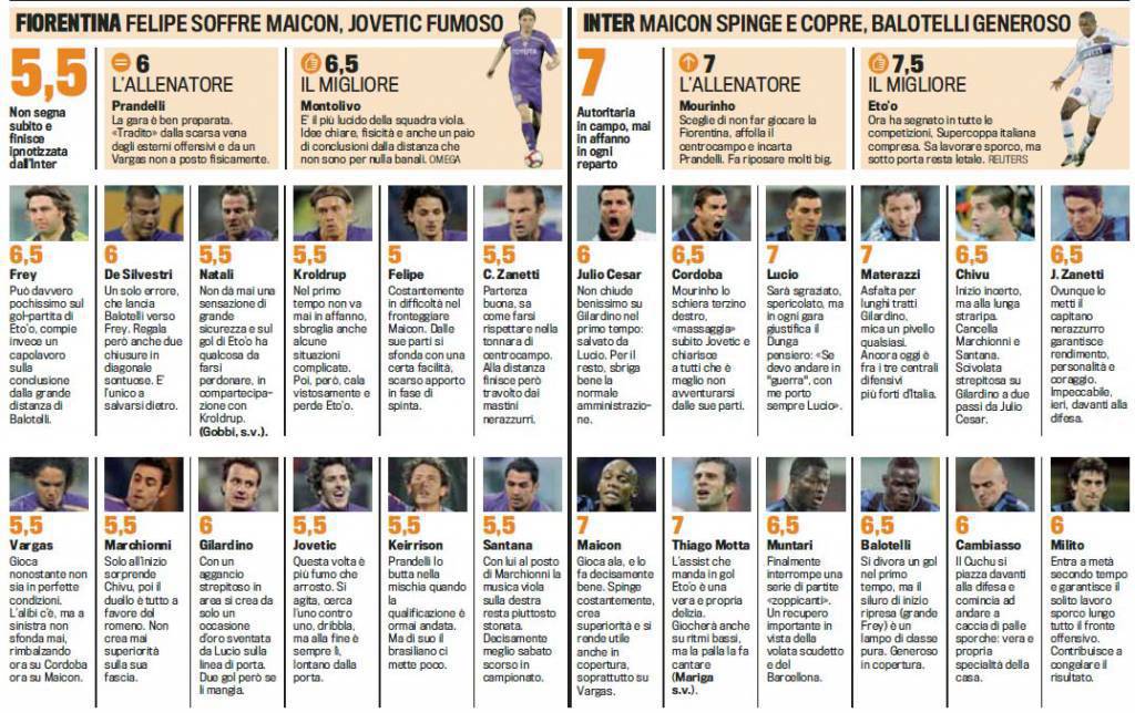 FIRENZE – Ieri sera l’Inter di Mourinho è volata in finale di Coppa Italia battendo la Fiorentina per uno a zero grazie al gol di Samuel Eto’o. Il camerunense ha ancora una volta dimostrato di attraversare un ottimo momento di forma. Nei viola buona la prestazione di Montolivo che ha cercato di dare geometrie alla manovra della formazione di Prandelli. Le pagelle della Gazzetta dello Sport.