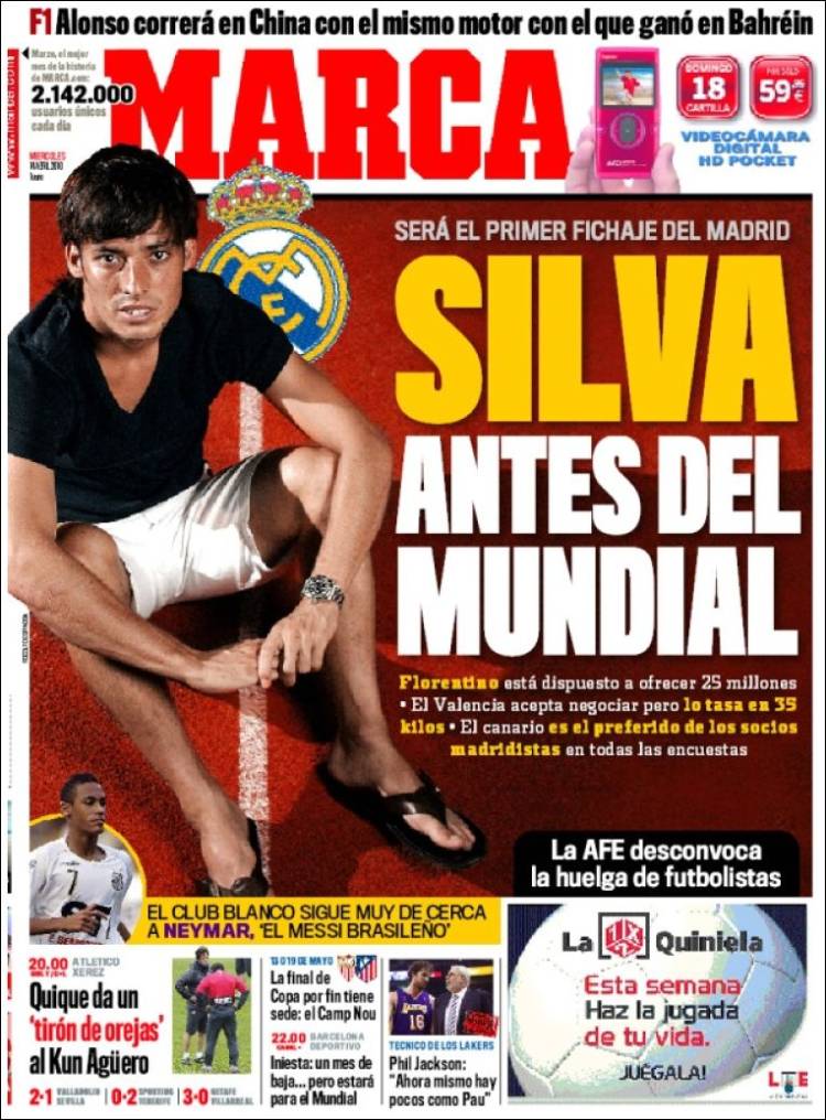 Il quotidiano spagnolo Marca parla del prossimo calciomercato del Real Madrid che prima del Mondiale dovrebbe annunciare l’acquisto di David Silva, esterno d’attacco del Valencia corteggiato anche dal Barcellona. Il giocatore spagnolo dovrebbe essere il primo grande acquisto della prossima stagione, nel mirino ci sono anche altri giocatori come Hamsik del Napoli.