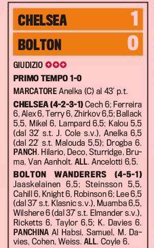 LONDRA (Inghilterra) – Il Chelsea di Ancelotti si avvicina sempre di più alla vittoria in Premier League grazie ai tre punti conquistati ieri contro il Bolton. A decidere la gara è bastata una zampata di Anelka, che ha permesso ai “Blues” di portarsi a più quattro sul Manchester United a quattro giornate dal termine. Per il manager italiano si tratterebbe di un grande successo ottenuto al suo primo anno di calcio inglese. Ecco le pagelle della Gazzetta dello Sport.