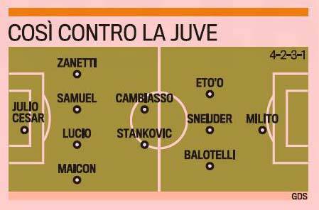 MILANO – Sulla Gazzetta dello Sport emergono le prime indiscrezioni riguardo alla formazione dell’Inter in vista della sfida di domani sera contro la Juventus. Josè Mourinho dovrebbe mettere in campo la migliore formazione possibile con Balotelli al posto di Pandev, mentre in difesa confermato il capitano Zanetti a sinistra e Stankovic recuperato a centrocampo.