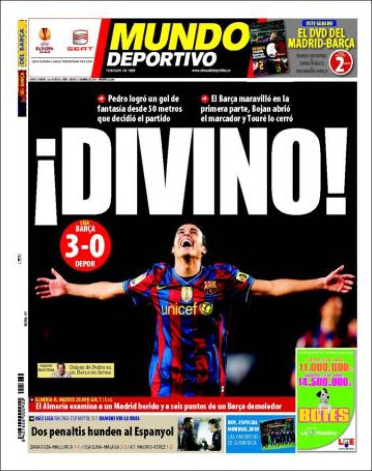 Il Mundo Deportivo celebra un’altra grande prestazione del Barcellona di Guardiola che in campionato stende il Deportivo con un perentorio tre a zero. In mezzo c’è il fantastico gol di Pedrito che da centrocampo inventa una parabola impossibile che si insacca in rete. L’aggettivo divino calza sicuramente a pennello per le prestazioni di Messi e compagni sempre più travolgenti.