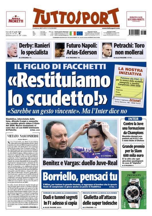 Anche su Tuttosport si parla dell’intervista di ieri del figlio di Facchetti durante la puntata delle Iene, in cui si parla delle telefonate tra l’ex compianto presidente nerazzurro e Bergamo. Inoltre da Gianfelice Facchetti è arrivata la proposta di lasciare lo scudetto del 2006 in modo da far terminare i continui veleni piovuti dopo le ultime intercettazioni di Calciopoli 2.
