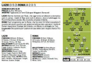 ROMA – Tra 2 giorni sarà tempo di derby nella capitale, uno dei più decisivi degli ultimi anni. La Roma intende vincere per confermare il primato e tenere dietro l’Inter, la Lazio per salvarsi il prima possibile ed allontanare lo spettro della Serie B. Ecco come scenderanno in campo le 2 squadre, secondo la ‘Gazzetta dello Sport’, a circa 50 ore dal big match: