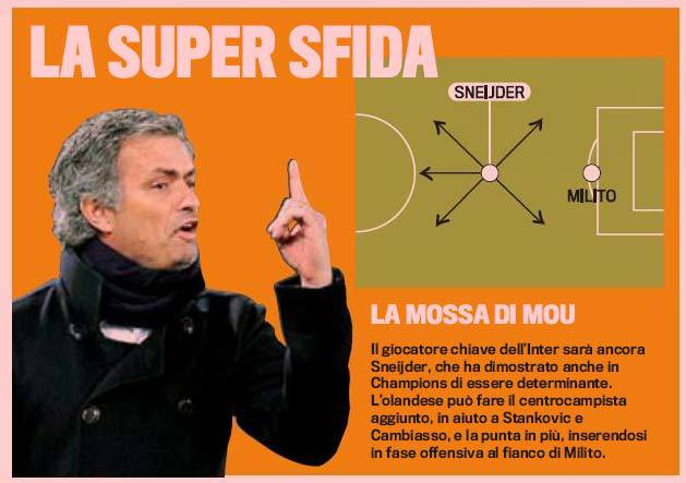 MILANO – Questa sera Josè Mourinho e tutti i tifosi dell’Inter si aspettano molto dal solito Sneijder. L’olandese è ormai l’elemento fondamentale nello scacchiere tattico del portoghese visto che può essere impiegato in più ruoli. La Gazzetta dello Sport ha analizzato la posizione dell’ex Real Madrid che può aiutare il centrocampo e dare una mano anche a Diego Milito in attacco.