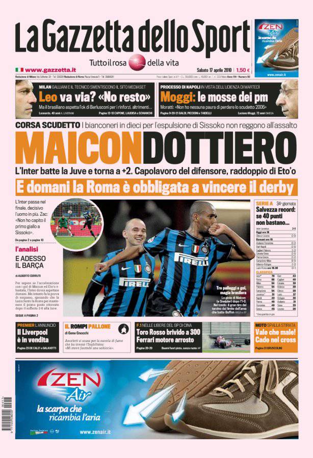 Sulla Gazzetta dello Sport titolo emblematico che parla della vittoria dell’Inter di Mourinho contro la Juventus nell’anticipo della 34a giornata di Serie A grazie ad un grande prodezza di Maicon e al gol di Samuel Eto’o. La formazione di Zaccheroni è rimasta in dieci dopo trentasette minuti per l’espulsione del centrocampista africano Sissoko. Ora i nerazzurri sono nuovamente in testa alla classifica e attendono il risultato del derby di Roma.