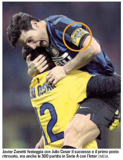 MILANO – La Gazzetta dello Sport ha immortalato la fascia di capitano di Javier Zanetti durante il match tra Inter e Juventus. Una fascia speciale regalata dalla società nerazzurra all’argentino per celebrare le 500 partite in Serie A tutte con la maglia dell’Inter. E pensare che quando fu acquistato l’argentino era visto solo come un rincalzo, invece dopo 15 anni è il capitano dell’Inter di Josè Mourinho.