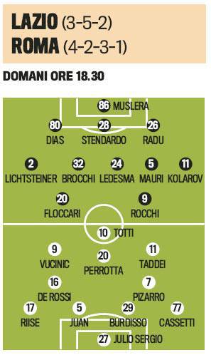 ROMA – Partita delicatissima, dopo Inter-Juve di ieri sera sarà quella di domani alle ore 18.30 tra Lazio e Roma non solo perchè è un derby ma perchè può decidere anche le sorti di uno scudetto. Ecco le probabili formazioni della gara prese dalla Gazzetta dello Sport su un derby che si preannuncia ricco di emozioni e di tensione.