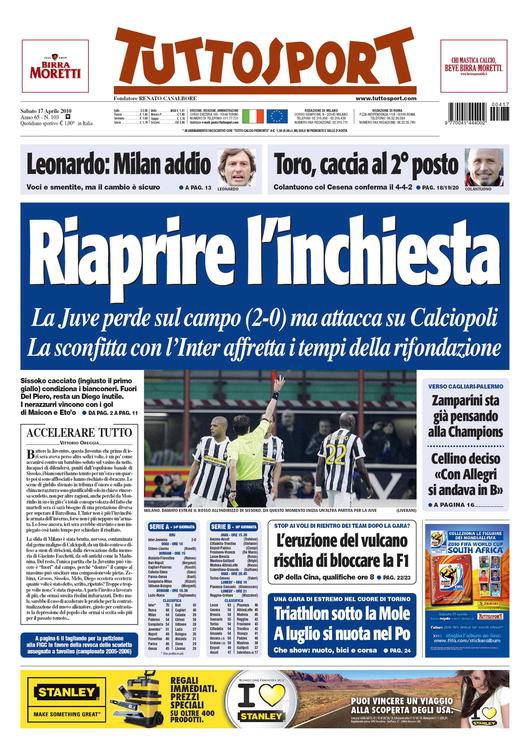 Tuttosport apre stranamente con un titolo su Calciopoli ignorando almeno in parte la sconfitta della Juventus ad opera dell’Inter di Mourinho. Sul quotidiano torinese si parla anche di rifondazione bianconera, visto che in questa stagione Del Piero e soci hanno incassato tredici sconfitte in campionato, un record negativo. Per il futuro si parla insistentemente di Rafa Benitez.