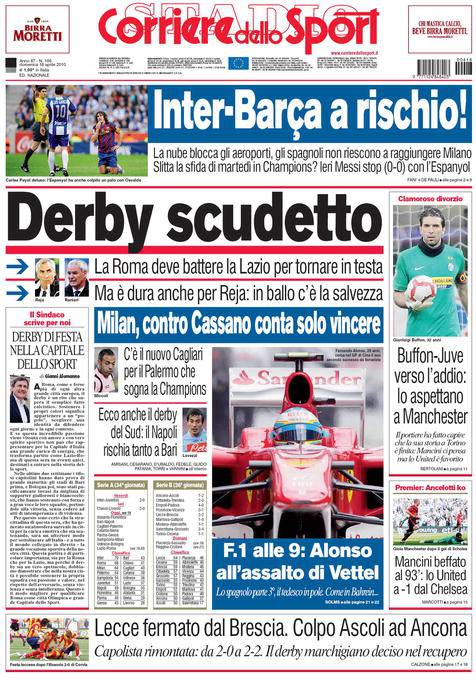 ROMA – Il quotidiano della capitale si concentra, inevitabilmente, sul derby tra Roma e Lazio, considerandolo, addirittura decisivo per la corsa allo scudetto. I giallorossi di Claudio Ranieri sognano di tornare in vetta alla classifica di Serie A, mentre i biancocelesti di Edy Reja sono alla ricerca di punti salvezza ed, inoltre, hanno come obiettivo quello di fare uno sgambetto ai rivali della Roma, favorendo l’Inter nella vittoria dello scudetto. In primo piano anche il rischio di un rinvio di Inter-Barcellona, a causa di possibili problemi con le linee aeree, che impedirebbero ai blaugrana di raggiungere Milano.