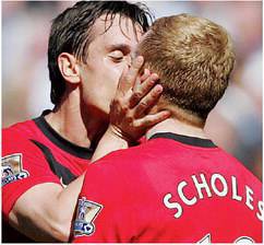 MANCHESTER (Inghilterra) – Incredibile quanto successo ieri nel derby di Manchester tra il Manchester City ed il Manchester United. Stando alla foto riportata dal Corriere dello Sport, il terzino Gary Neville avrebbe dato un bacio in bocca al centrocampista Paul Scholes che ha regalato i tre punti ai Red Devils nell’ultimo minuto di recupero con un gol di testa .