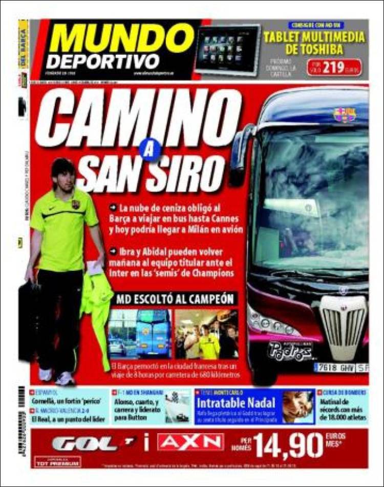 BARCELLONA (Spagna) – Il quotidiano catalano dedica la prima pagina alla difficile trasferta del Barcellona, costretto a spostarsi a Milano in autobus a causa del blocco dei voli in Europa. Il viaggio di più di 900 km potrebbe affaticare i fuoriclasse catalani e portarli a Milano senza essere al 100%.