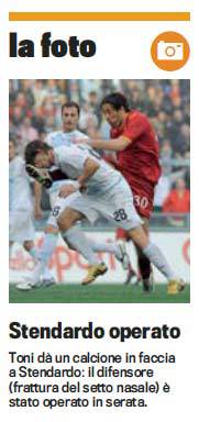 ROMA – Dopo appena pochi minuti dall’inizio del ‘Derby della Capitale’ il difensore della Lazio, Guglielmo Stendardo, è stato costretto a lasciare il campo da gioco per essere immediatamente trasferito all’ospedale a causa di un brutto colpo ricevuto in pieno viso da Luca Toni, bomber della Roma. La botta, accidentale, ha procurato al giocatore la frattura del setto nasale per la quale si è resa necessaria una operazione eseguita in serata. Ecco l’immagine dell’incidente tratta dalla ‘Gazzetta dello Sport’.