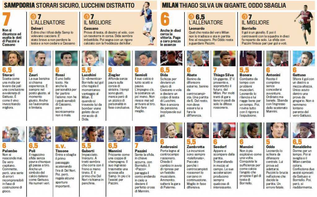 GENOVA – Ecco le pagelle della ‘Gazzetta dello Sport’ relative alla sfida di campionato tra Sampdoria e Milan, risolta al 94′ minuto da uno stacco imperioso del bomber blucerchiato Giampaolo Pazzini. Sfida equilibrata, anche nei voti. Spiccano infatti Cassano e Pazzini tra i padroni di casa e Borriello e Thiago Silva tra i rossoneri. Ottime le prestazioni dei due portieri, Storari e Dida.