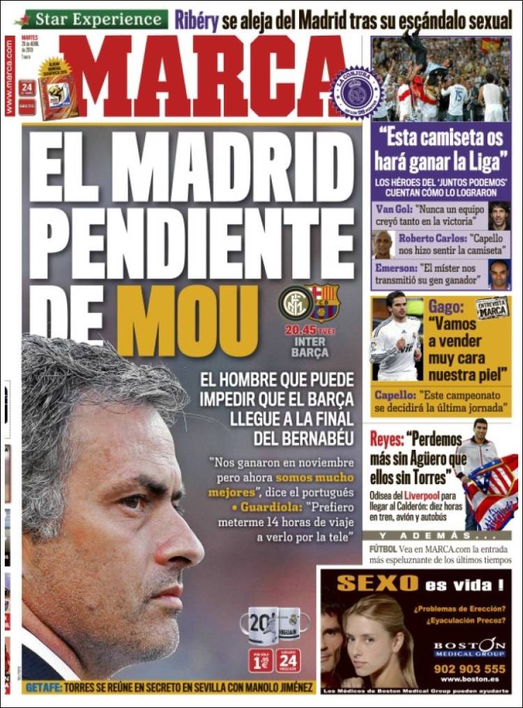 Sul quotidiano spagnolo Marca, molto vicino agli ambienti del Real Madrid, si parla della semifinale di Champions League di questa sera tra Inter e Barcellona con i madrileni che sperano in una vittoria dei nerazzurri di Mourinho per evitare che i catalani possano giocare la finale di Champions proprio a Madrid allo stadio Bernabeu. Un ostacolo duro per i nerazzurri che saranno sostenuti anche dai tifosi madrileni.