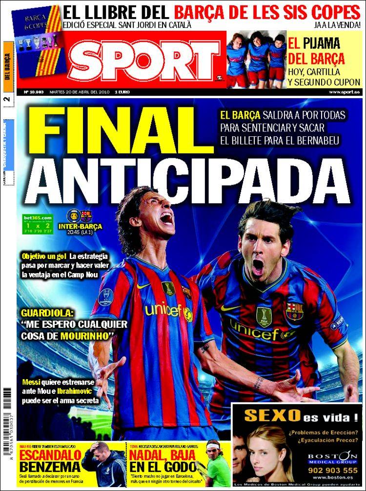 Anche l’altro quotidiano spagnolo Sport parla di una finale anticipata quella tra il Barcellona di Messi e Ibrahimovic e l’Inter di Mourinho e l’ex Samuel Eto’o. Guardiola proverà a raggiungere la finale per la seconda volta consecutiva, con l’ultimo match di coppa che si disputerà a Madrid, nel tempio dei rivali storici. Dall’altra parte c’è un’Inter pronta a punire i catalani.