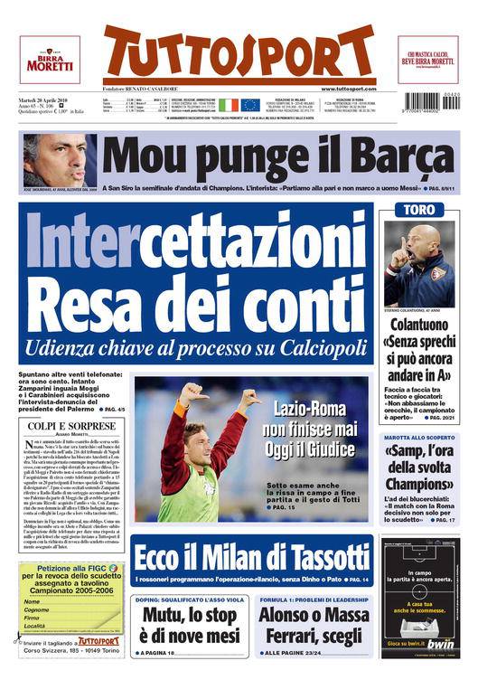 Su Tuttosport non si parla della semifinale di Champions League tra Inter e Barcellona bensì della seconda udienza del processo Calciopoli che si terrà a Napoli e vede imputato Luciano Moggi, ex direttore della Juventus. Tra nuove intercettazioni, testimonianze e denunce ci saranno sicuramente colpi di scena con Moggi che continua a proclamarsi innocente.