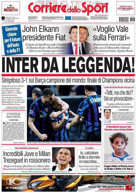 Anche il Corriere dello Sport omaggia l’Inter di Mourinho concedendo la prima pagina del giornale. I nerazzurri hanno battuto tre a uno il grande Barcellona di Guardiola grazie ad una prestazione super annichilendo le manovre dei catalani e soprattutto limitando uno spento Lionel Messi. Ora al ritorno la formazione di Mourinho dovrà difendere il prezioso risultato per arrivare in finale.