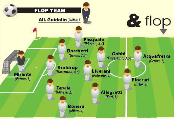 ROMA – Ovviamente il quotidiano romano ha elencato anche gli 11 peggiori del 34° turno di campionato: se l’attacco del Top Team è una miscela di tecnica e fantasia, la difesa del Flop Team è un aggregato di quanto di peggio hanno saputo fare dei difensori in realtà di ottimo livello, come Bonera e Kroldrup. Oltre naturalmente agli autori di 2 autogol ai limiti del paradossale, come Zapata e Bocchetti…