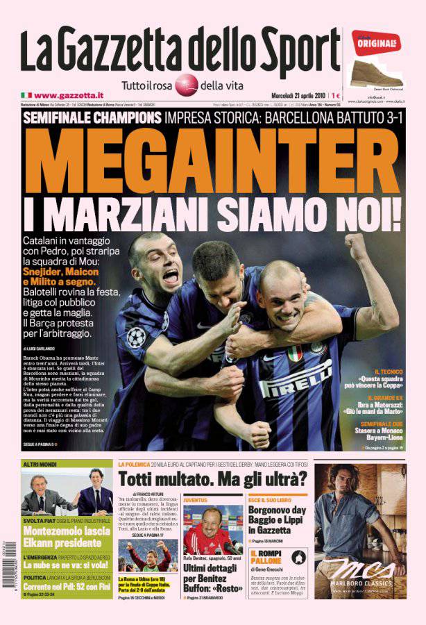 Sulla Gazzetta dello Sport si celebra la grande vittoria dell’Inter nell’andata della semifinale di Champions League contro il Barcellona di Lionel Messi. I nerazzurri sono passati in svantaggio a causa del gol di Pedro ma hanno poi recuperato prima con Sneijder e poi hanno dilagato con Maicon e Milito. Nei catalani pessima prova di Ibrahimovic, Messi e Xavi, mentre nei nerazzurri solito caso Balotelli.