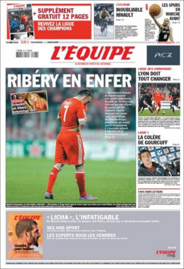 Sul principale quotidiano francese L’Equipe si parla del momentaccio di Frank Ribery accusato di aver avuto notti di passione con un’escort minorenne. Non solo, sul piano sportivo il campione francese del Bayern Monaco è stato espulso nell’andata delle semifinali di Champions League per un’entrata bruttissima su Lisandro Lopez attaccante del Lione. Il transalpino rischia di prendere due giornate saltando anche l’eventuale finale.