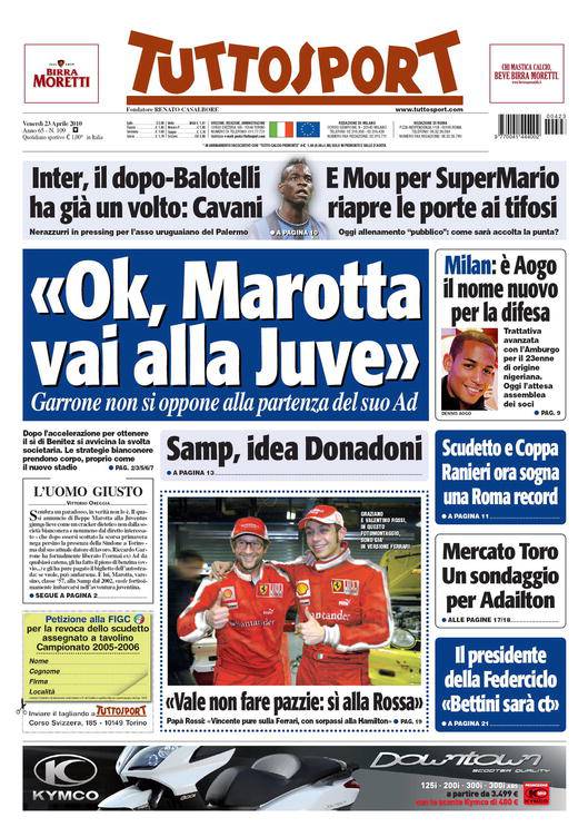 Su Tuttosport si parla delle dichiarazioni di ieri del presidente della Sampdoria Garrone che ha in un certo modo liberato Beppe Marotta dirigente blucerchiato seguito con interesse dalla Juventus dove ricoprirebbe il ruolo di direttore generale con Rafa Benitez in panchina. A questo punto manca solo l’ok definitivo dell’attuale dirigente della Sampdoria.