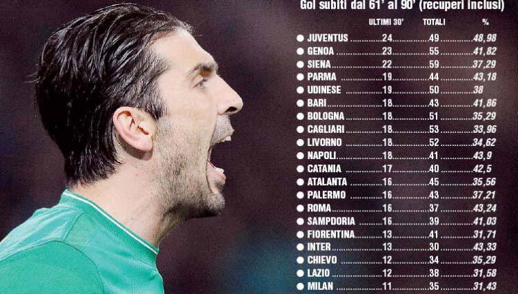 TORINO – Un’inchiesta realizzata oggi dal quotidiano torinese Tuttosport mette in evidenza un dato imbarazzanteo: la Juventus ha la peggior difesa negli ultimi 30 minuti. Andando ad analizzare le 34 gare stagionali, infatti, si scopre come i bianconeri abbiano subito ben 24 reti nell’ultima mezz’ora di gioco, davanti a Genoa, con 23, e Siena, con 22. Un sintomo chiaro che i giocatori della Juventus reggono solamente un’ora e che negli ultimi 30 minuti si “perdono”. Un dato imbarazzante soprattutto se confrontato con le rivali dirette per il campionato e la Champions. L’Inter ha inftti subito solo 13 reti, il Milan 11 e la Roma 16.