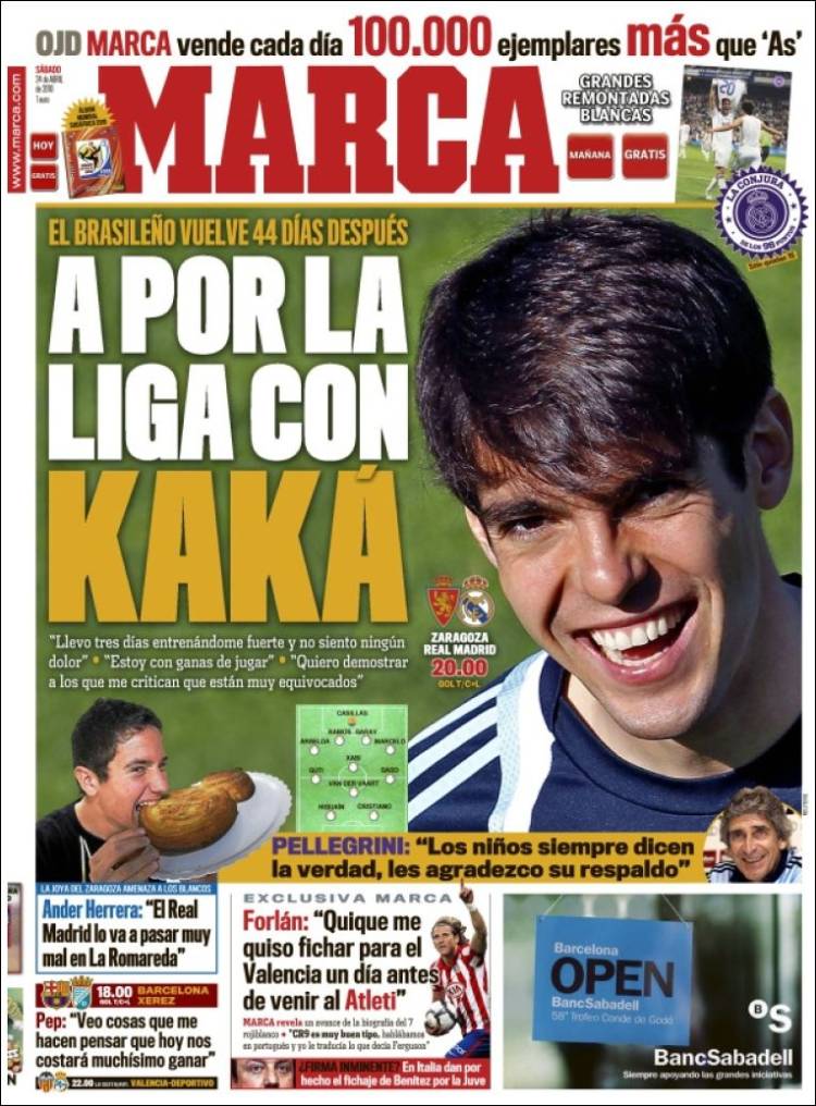 Il quotidiano spagnolo Marca, molto vicino al Real Madrid, parla delle “merengues” che potranno contare sul ritorno in campo di Ricardo Kakà quarantaquattro giorni dopo l’infortunio che lo ha tenuto lontano dai campi. La formazione allenata da Manuel Pellegrini ha un solo punto di svantaggio dal Barcellona di Guardiola e cercherà di scavalcare i blaugrana prima della fine del campionato.