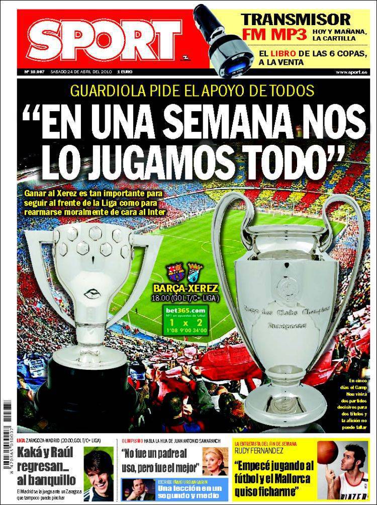 Sul quotidiano catalano Sport intervista al tecnico del Barcellona Pep Guardiola che ha spronato i suoi in vista della settimana decisiva per le sorti dei catalani. Prima la sfida in campionato con il Real Madrid lontano solamente un punto e poi il ritorno di Champions League contro l’Inter con i catalani che dovranno recuperare il tre a uno subito al Meazza martedì sera.