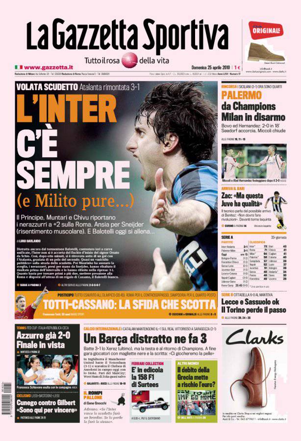 MILANO – La Gazzetta dello Sport, quotidiano di Milano, celebra la vittoria dell’Inter di ieri sera alle 18.00. I nerazzurri si sono, infatti, imposti per 3-1, stesso risultato della sfida con il Barcellona, contro l’Atalanta a San Siro. La Gazzetta esalta anche la prova di Diego Milito che, come capita nella maggior parte delle occasioni, è andato in rete, portandosi a quota 20 reti in questo campionato. L’Inter è ora in testa alla classifica con due punti di vantaggio dalla Roma che deve, tuttavia, ancora giocare, questa sera alle ore 20.45 in casa contro la Sampdoria di Antonio Cassano.