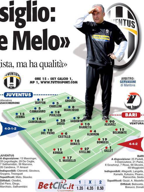 TORINO – La Juventus di Alberto Zaccheroni si appresta ad affrontare il Bari oggi alle ore 15.00. In attacco il tecnico sembra intenzionato a schierare la coppia Iaquinta-Del Piero. Dietro le punte dovrebbe giocare, nonostante le recenti prestazioni non particolarmente esaltanti, il trequartista brasiliano Diego. A centrocampo Figurano il danese Christian Poulsen, l’italiano Claudio Marchisio e Maruo German Camoranesi. Difesa a 4 con Fabio Grosso, Fabio Cannavaro, Zebina e Chiellini.
