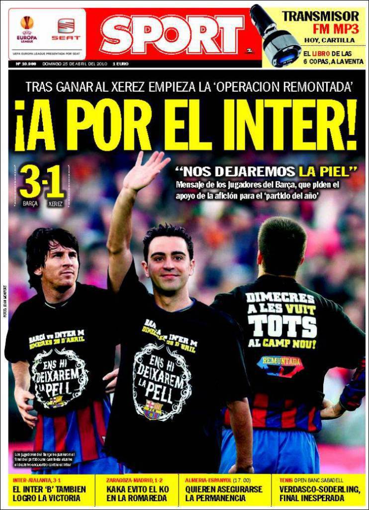 La stampa catalana, Sport, parla già della sfida fra il Barcellona e l’Inter che si terrà mercoledì prossimo al Camp Nou. Una sfida che si preannuncia caldissima e che vedrà la partecipazione in massa del popolo blaugrana. Ieri, infatti, dopo la vittoria dei catalani sullo Xerex, i giocatori del Barca hanno indossato delle maglie per invitare il tifosi al Camp Nou e nel contempo annunciando che “venderanno cara la pelle” in vista della supersfida. Non ci resta quindi che attendere mercoledì sera e sederci comodi sul divano, o magari, per i più fortunati, accomodarsi su un seggiolino dello stadio di Barcellona…
