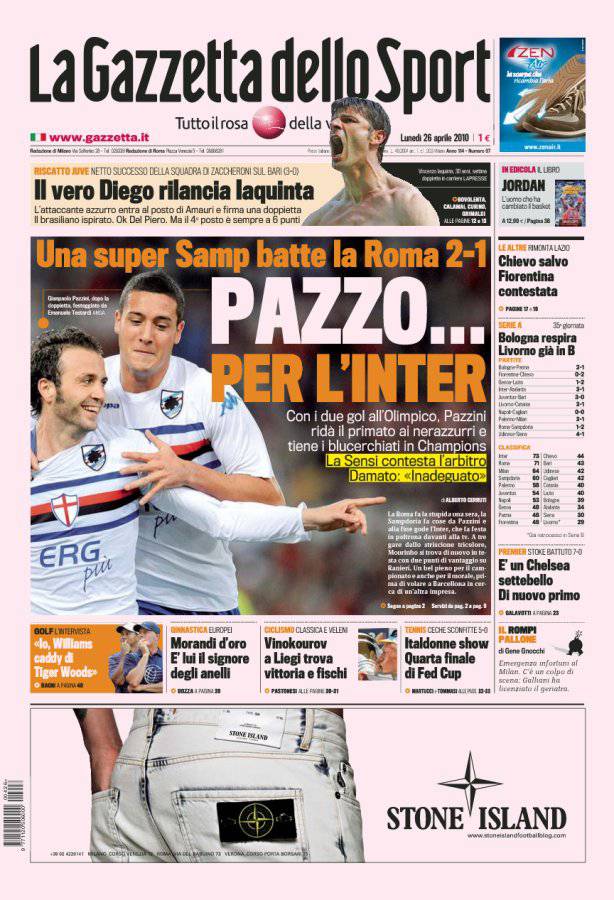 Sulla Gazzetta dello Sport si parla della clamorosa vittoria di ieri sera della Sampdoria sul campo della Roma che permette all’Inter di Mourinho di volare in testa alla classifica con due punti di vantaggio sui giallorossi. Il protagonista della serata è stato sicuramente il centravanti della Sampdoria Pazzini che ha siglato la doppietta forse decisiva per le sorti del campionato italiano.