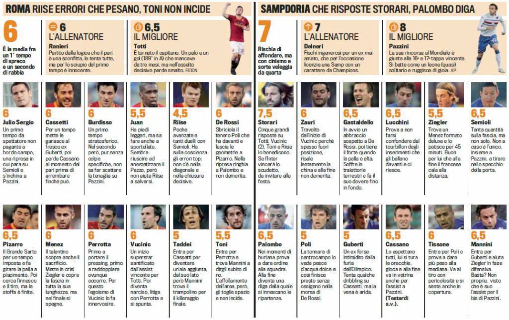 ROMA – La grande vittoria della Sampdoria di Del Neri all’Olimpico contro la Roma portano le firme di Pazzini, autore della doppietta decisiva e Storari, portiere doriano che ha sventato da campione molti tiri insidiosi dei giocatori della Roma. Nei giallorossi buona prova di Totti mentre disastrosa quella di Riise che in entrambi i gol blucerchiati non ha coperto a dovere Pazzini. Le pagelle della Gazzetta dello Sport.